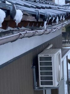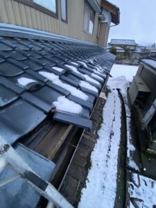 本屋から落ちた雪で下屋の瓦、雨樋、屋根垂木が破損しております。